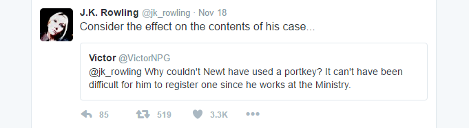 Confesso que outro factor que me levou a antecipar este filme como uma criança foi o facto de esta vez ser J. K. Rowling a escrever o guião e não só a aconselhar como aconteceu em Harry Potter. A escrita da autora é o que de melhor os livros têm, através das suas descrições conseguimos ver um mundo completo e sabemos que mesmo os factos que não estão escritos existem para ela. Um exemplo real disso mesmo é a questão que encontrei inúmeras vezes, ao passear-me pela internet, sobre o feitiço de Apparate. Muitos fans perguntaram, ao ver o filme, porque é que o Newt viaja de barco e não usa este feitiço que seria mais conveniente. J. K. Rowling respondeu a esta pergunta, através do seu twitter pessoal, no dia 18 de Novembro com o seguinte “Há um limite para a distância do Apparate. Apparition intercontinental é muito perigosa!”. No seguimento desta resposta, os fans insistiram que Newt podia sempre usar um Botão de Transporte mas Rowling explica que o conteúdo da mala de Newt seria prejudicado com esse modo de transporte.